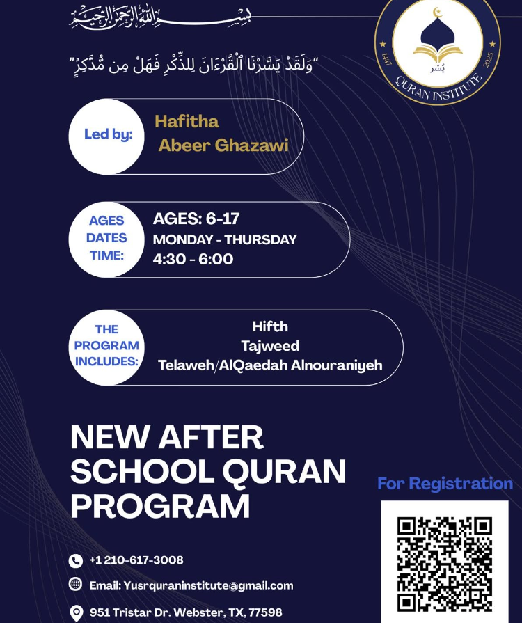 The program will include tajweed, memorization, AlQaidah Alnouraniyah, and tafseer insights on how to live with the Quran inshaAllah.